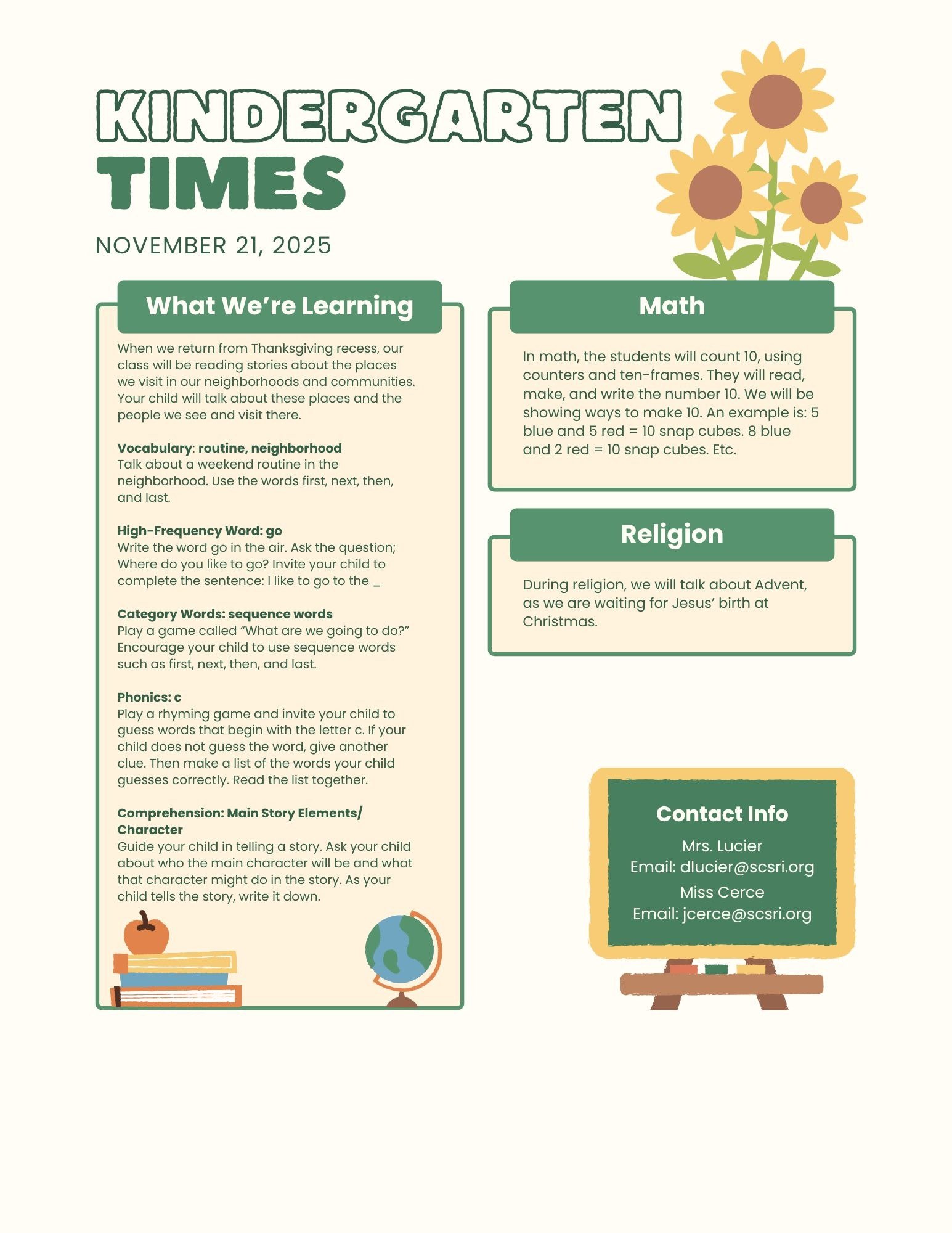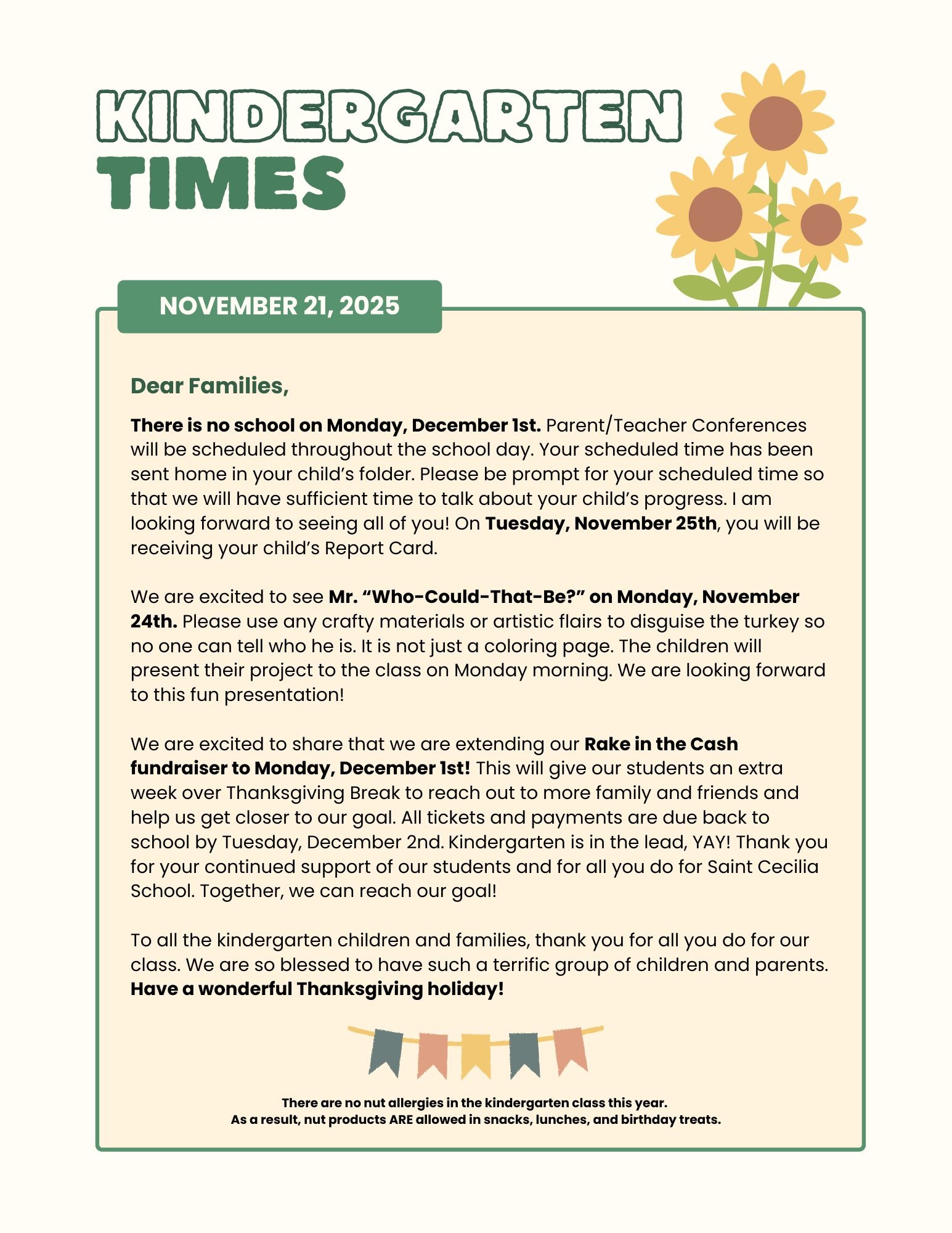 We participate in the Scholastic Book School Program. Our classroom code is H3CW8. Many of you are very aware of Scholastic Books because you have older children who have attended or who are attending St. Cecilia School. If this is your first experience, we would like to encourage you to consider building your child's library. It is a fairly inexpensive way to purchase books and it also supports our classroom library. When you purchase books, we get "points," which enable us to receive books for the classroom. Ordering these books is easily done online. The easiest and best method of payment is credit or debit card right on the Scholastic Website. We will receive notification when you place an order and will be watching for your books to arrive at school. Thank you in advance for supporting this important part of our kindergarten year.